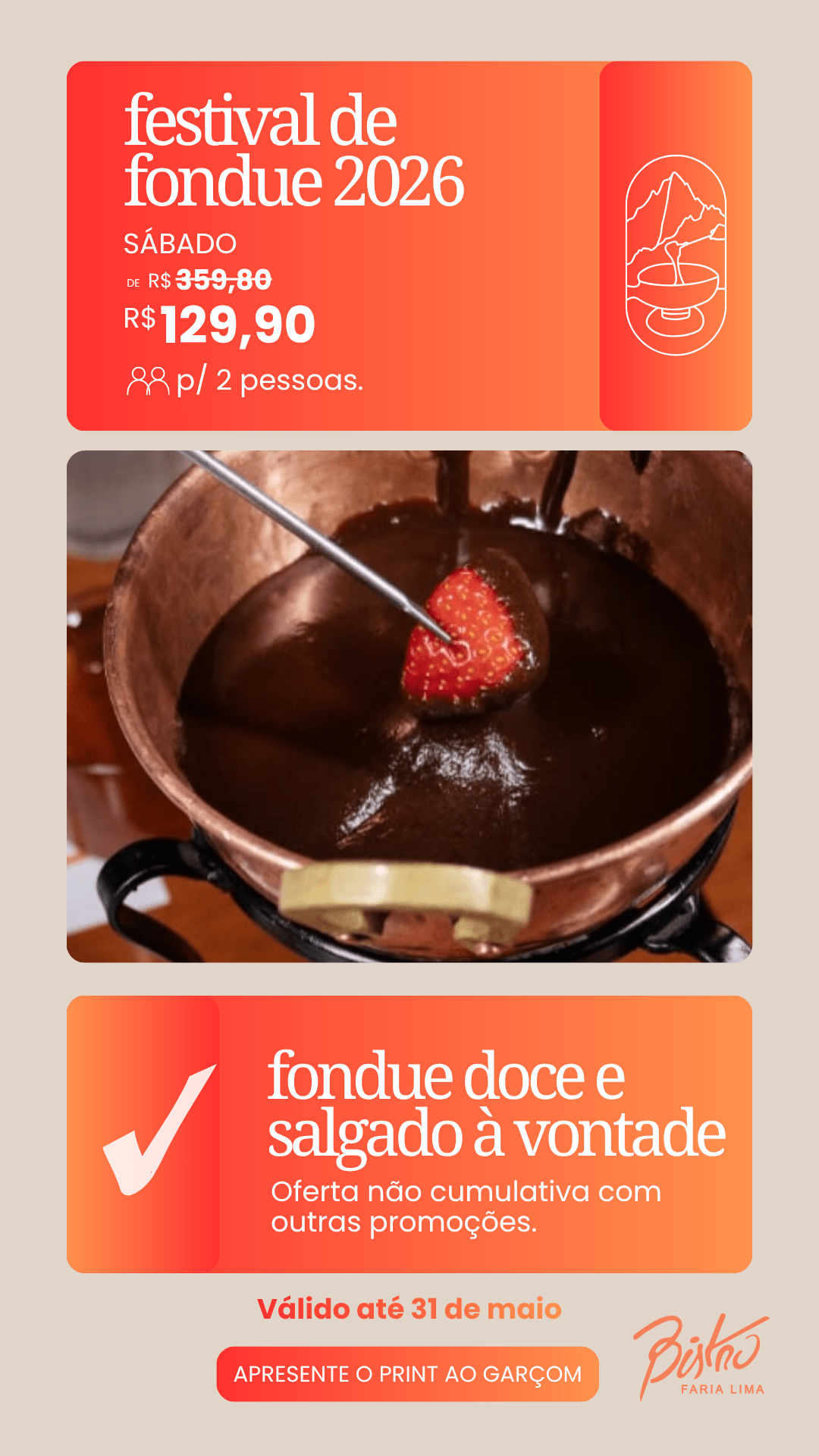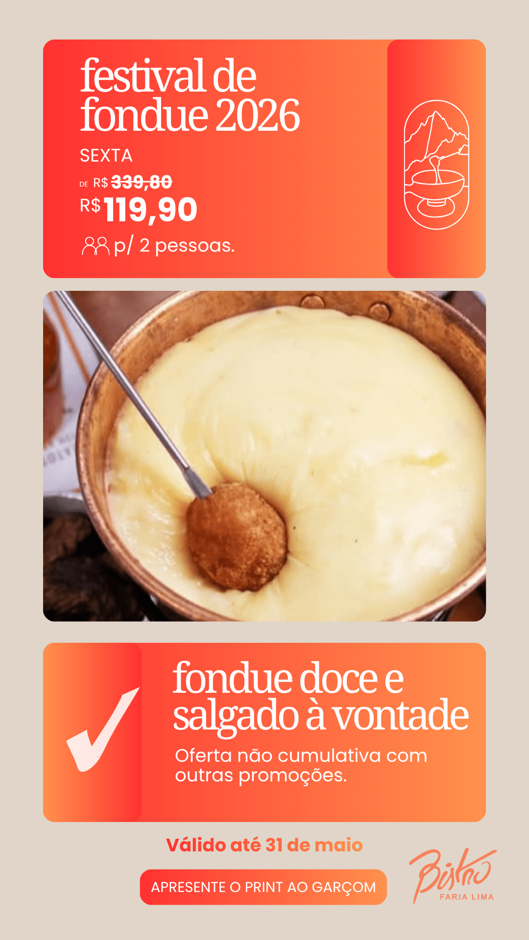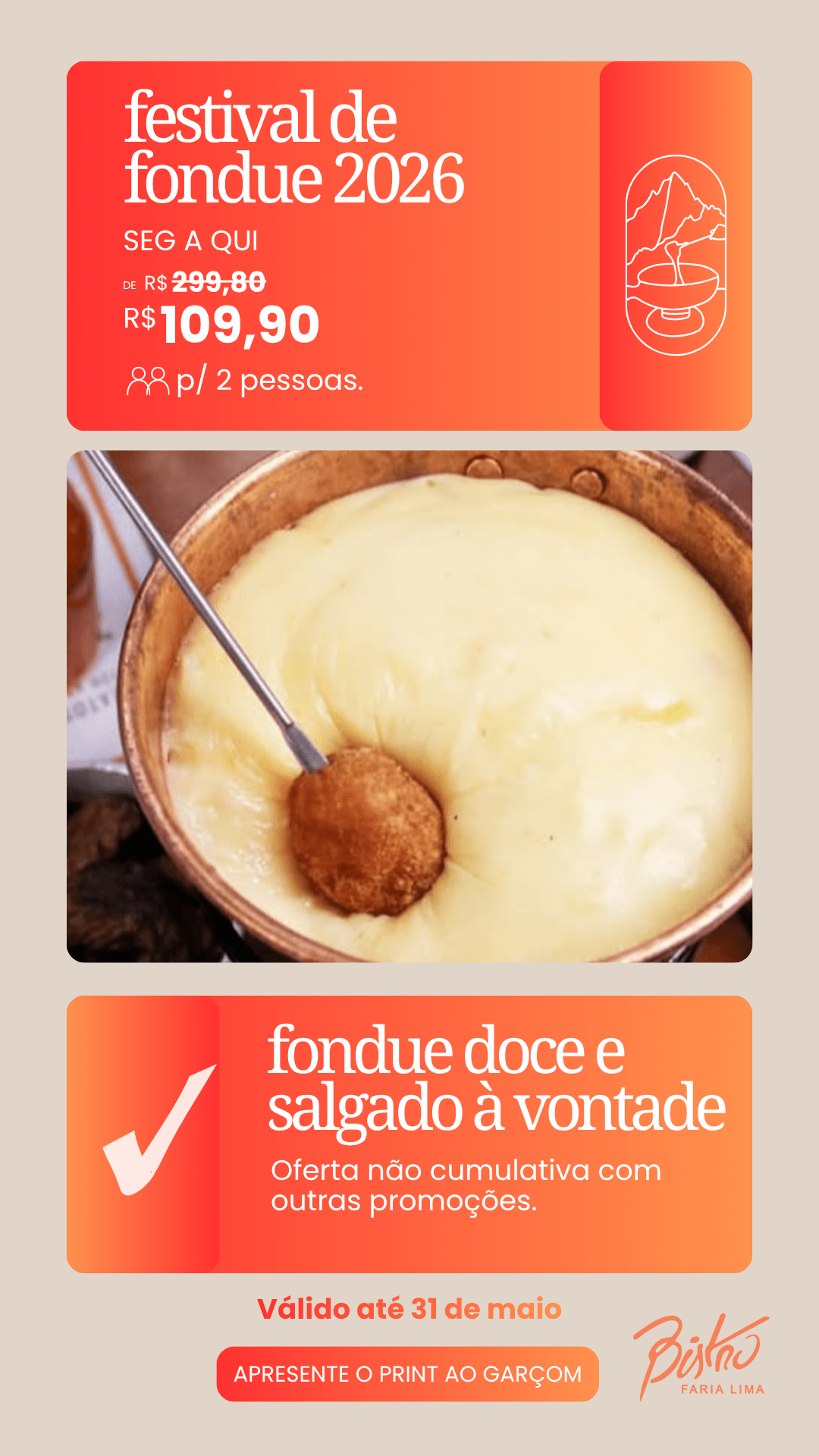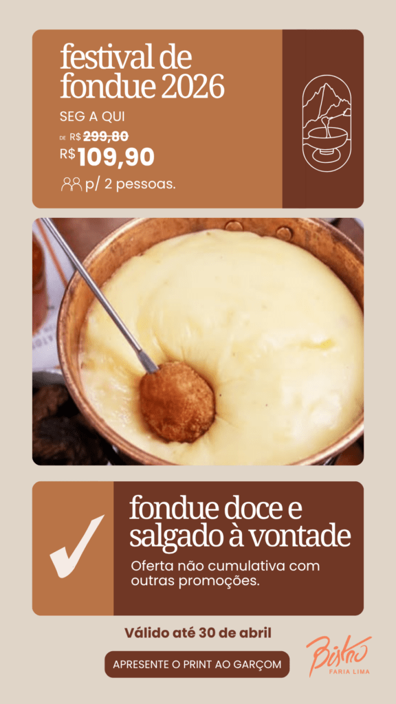 O Bistrô realiza um Festival de Fondue com opções salgadas e doces à vontade, uma experiência pensada para quem deseja aproveitar momentos especiais à mesa.